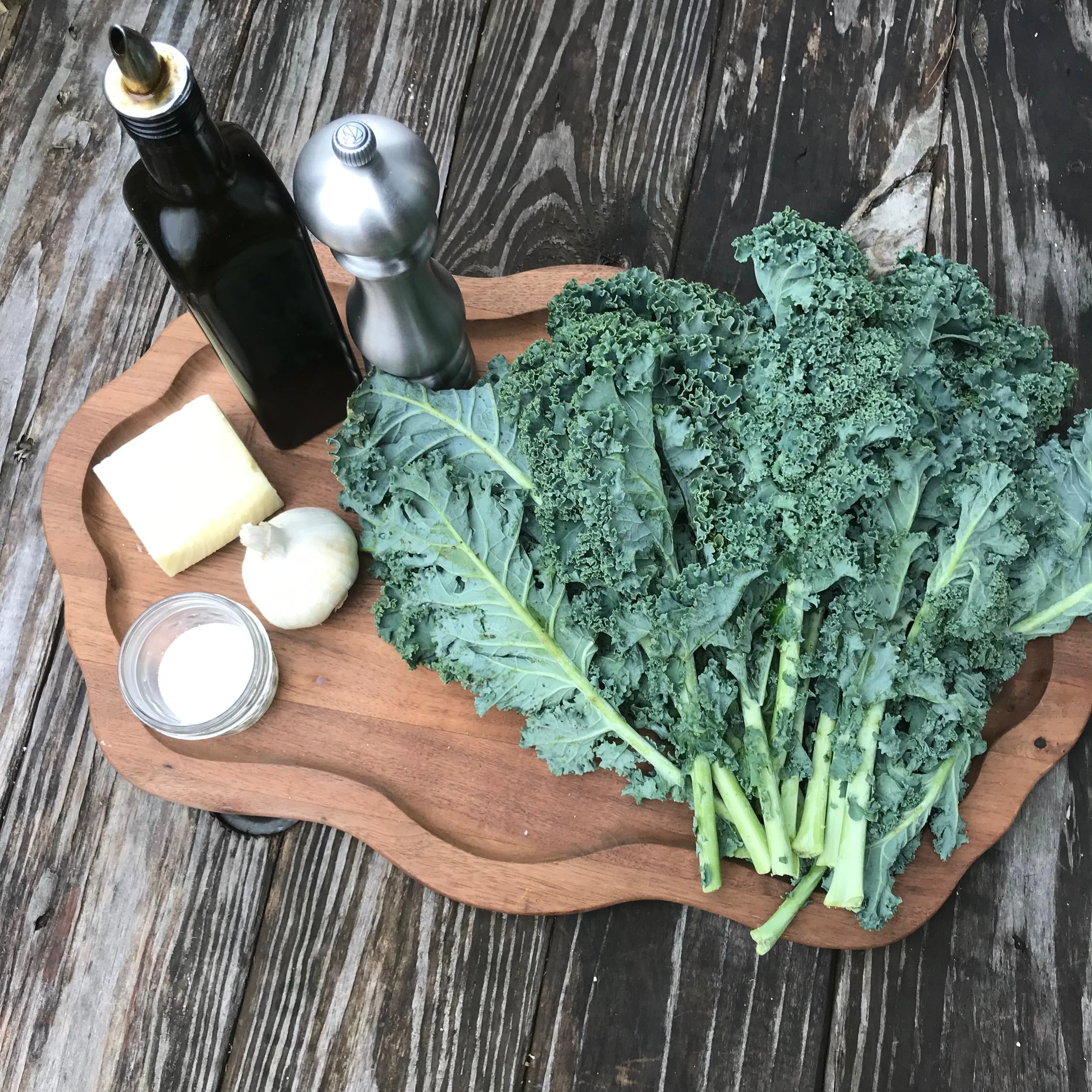 1 pound or about 2-3 bunches of kale (any variety), thick midribs cut out (composted or save for another recipe) and well rinsed.